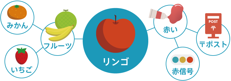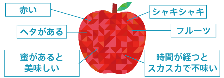 林檎は、赤い、フルーツ、ヘタがある、シャキシャキ、蜜があると美味しい、時間が経つとスカスカで不味い、こういう細かい情報がありますよね。