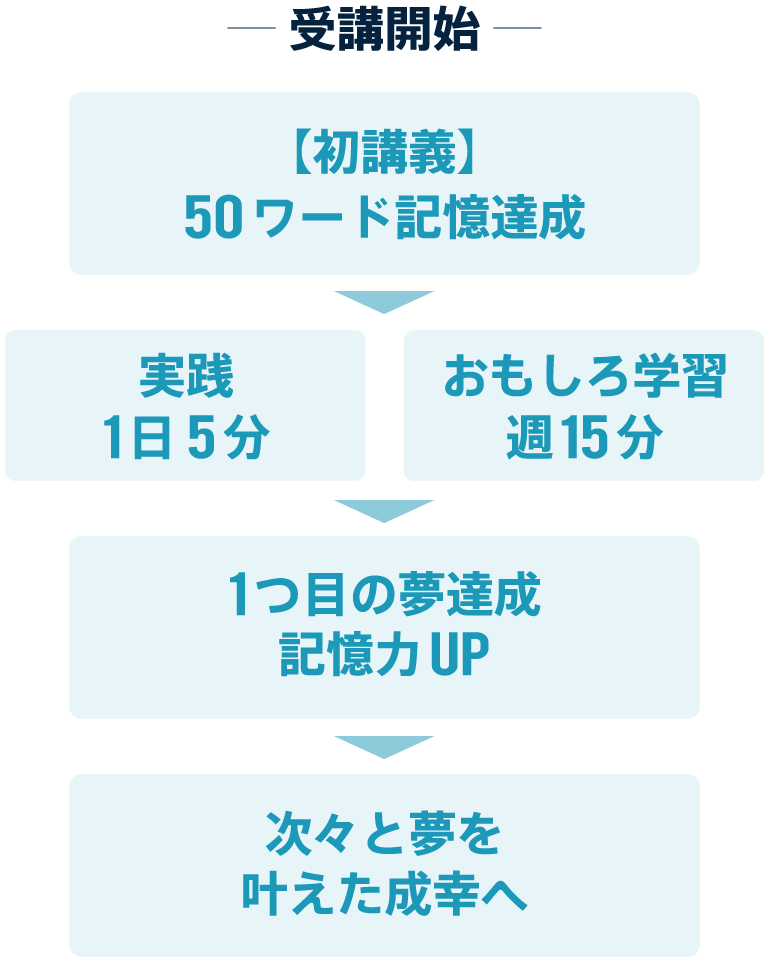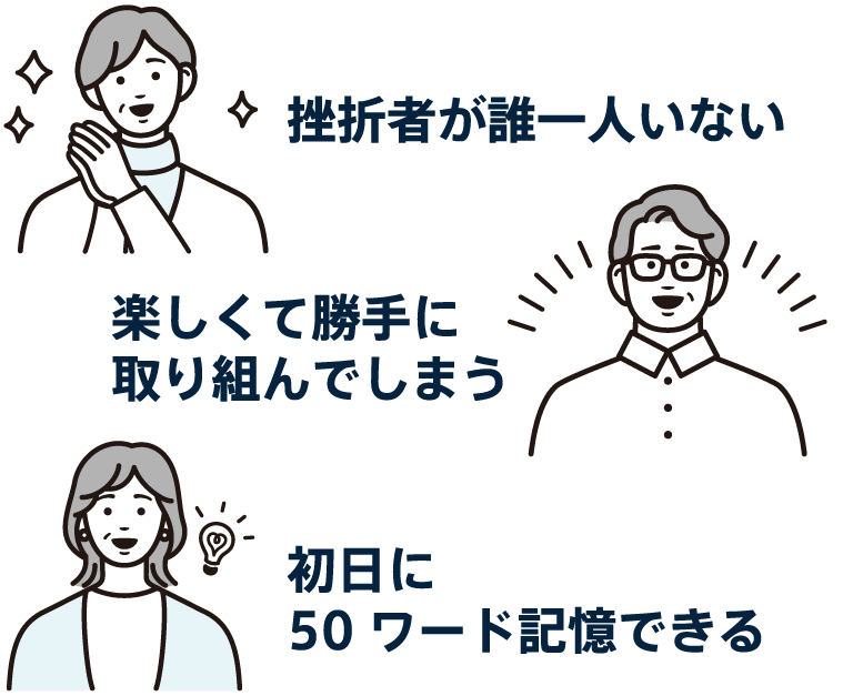 受講10~15分で50個の単語が覚えられ、講座後は100個の単語も簡単に覚えられるようになりました!実生活でも使っていて、あまりの変わりようにびっくりしました。