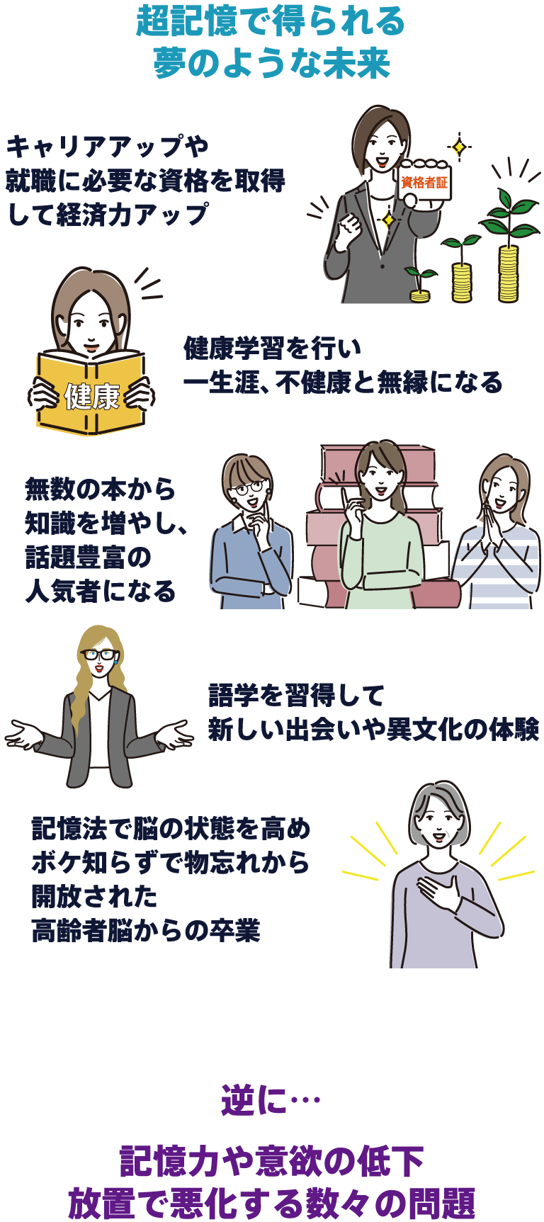 そのことで、記憶力がいいという自信がいっきに崩れてしまい認知症と診断され、鬱っぽくなりました。なんとかしようと脳トレやサプリを飲んだりしても効果がなく、悩んでいる時に超記憶法に出会いました。